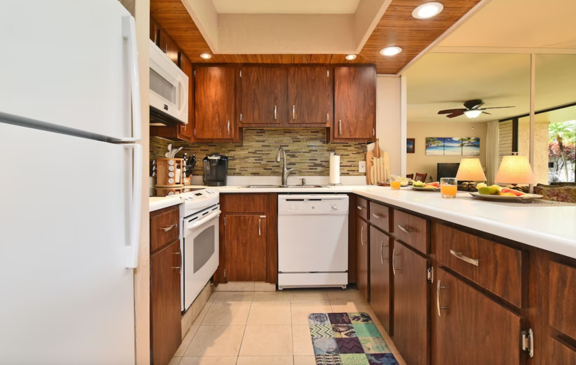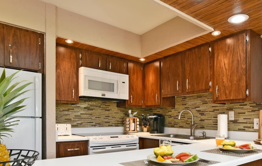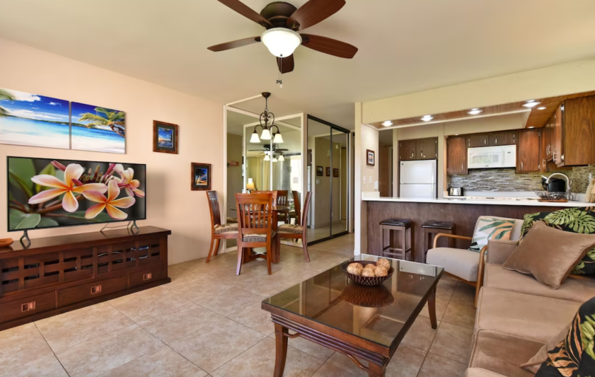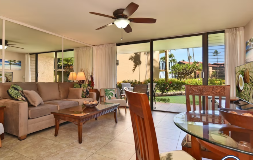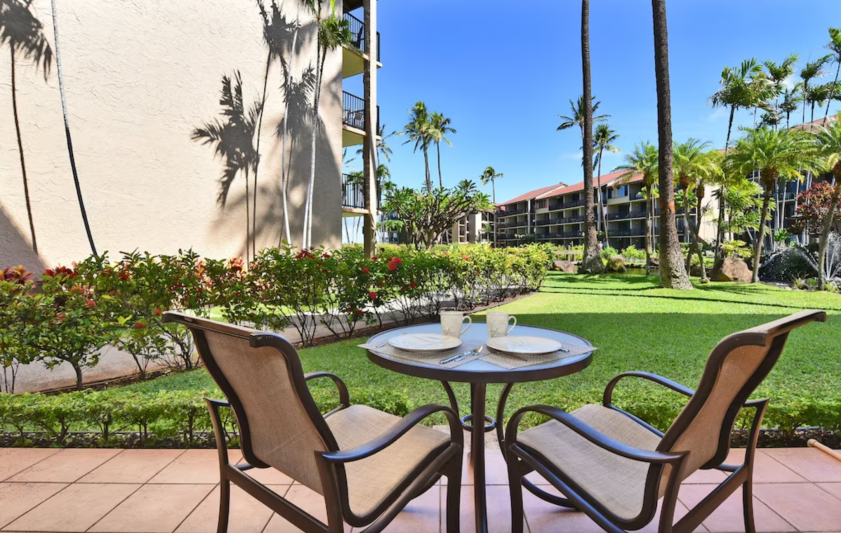 The unit has free Wi-Fi, a new flat-screen TV in the living room as well as a flat-screen TV in the bedroom. The bed is a new King-sized bed in the bedroom and a new Queen-sized sofa bed in the living room. It comes with everything you need including a fully equipped kitchen including a Keurig coffee maker and a drip coffee maker. It has a washer and dryer suite with soap included. It has beach towels, beach chairs, boogie boards, beach umbrella and a cooler etc. Enjoy the tropical breezes and Maui sunsets while relaxing on your patio and looking right at the koi pond & fountain. Maui doesn’t get any better than this!