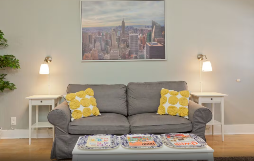 This spacious guest apartment has been recently updated to include a new kitchen, new appliances, and new furniture. It has a queen size bed with fresh linens, a comfortable living room with everything that you need for your stay including a foldout couch for additional sleeping. There’s a range/stove and a dishwasher for eating in with pots and pans along with any dishes that you might need during your stay. There’s a new mini-split ductless AC and heating system to keep the place comfortable all year. The walk in closet is perfect for all of your storage during your stay.